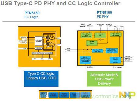 不同的應用場景,不同的複雜度層次,NXP有不同的產品和方案來搭配,為設計者提供達到係統最佳化的方案。下圖中展示了NXP的CC邏輯控製和PD PHY方案。吳韶阡介紹說,如果是低於15W的供電,或者是不需要支持多功能的設計,可以采用簡單的CC邏輯控製;而一個完整的USB Type-C方案就需要使用完整的PD方案,相應的元器件也會增加。