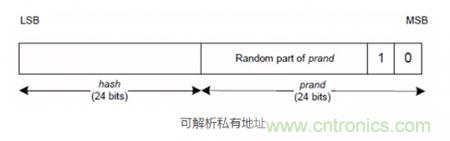 當設備B需要生成隨機地址的時候,其內部會首先生成一個隨機數prand,基於prand隨機數,設備B需要利用哈希hash算法生成可解析隨機地址的另外一部分,hash。prand隨機數和哈希hash分別占用24比特,計算公式為: