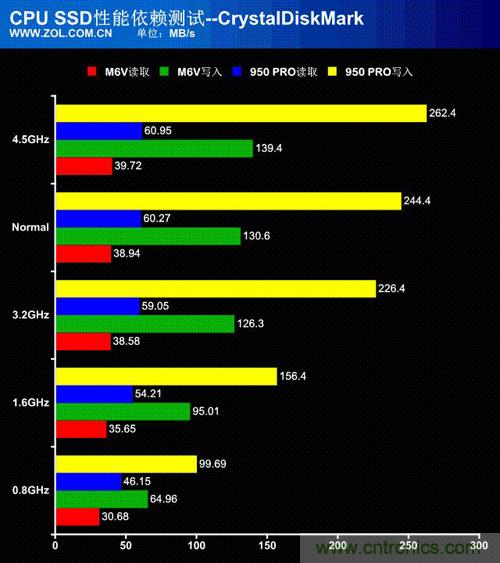 接下來的CrystalDiskMark測試,SSD的性能表現基本和AS SSD Benchmark相似,隨著CPU的頻率提升,SSD的4KB讀取和寫入都得到了顯著的提升。