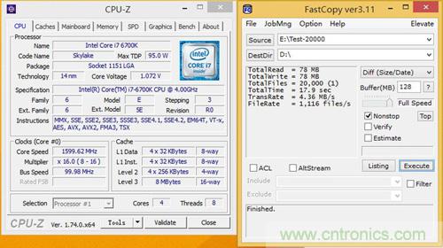 最後我們再來看看CPU頻率對SSD讀寫4KB小文件的速率影響,測試僅以四核1.6GHz和4.5GHz兩種配置成績對比,並開啟CPU超線程技術。為避免性能瓶頸,測試以浦科特M6V SATA 6Gbps SSD作為基準,與三星M.2 SSD 950 PRO互相拷貝4KB小文件,使用Fastcopy記錄讀寫時間和讀寫速率。(測試文件包包含20000個4KB TXT文檔)
