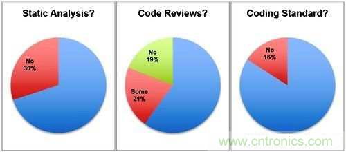 接著讓我們繼續更深入一點探討:要符合產業安全性標準,可能耗費大量成本與時間,那麼要實現一個優良設計的其他最佳實作呢?例如在軟體設計上使用編碼標準、程式碼審查以及統計分析?在這個技術領域從事攸關安全裝置設計的工程師受訪者們的回應更令人擔心了,請看下圖的統計: