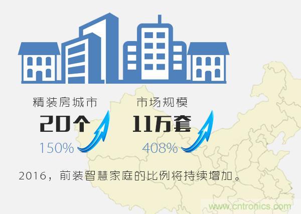 2015年各大地產商和物業公司都在推出智慧家庭和智慧社區的產品或樣板,包括花樣年、招商地產、金地物業、保利地產、萬科等。據奧維數據顯示,2015年有智能精裝房的城市達到20個,同比增長150%;市場規模達到11萬套,同比增長408%。2016年麵對低迷的樓市,為了維持房價,商品房中前裝智慧家庭的比例還會增加。