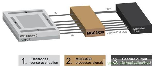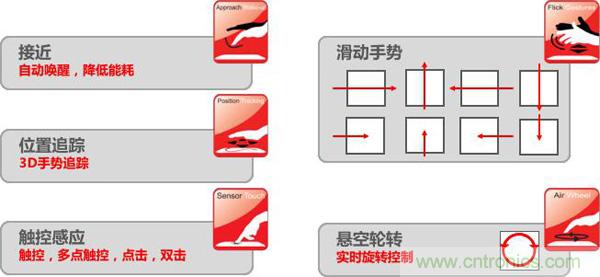 其中比較有代表性的,要數Microchip公司的GestIC技ji術shu。它ta基ji於yu電dian場chang感gan應ying的de原yuan理li,在zai電dian子zi設she備bei周zhou邊bian的de空kong間jian中zhong形xing成cheng一yi個ge電dian場chang。當dang手shou部bu在zai空kong間jian中zhong運yun動dong時shi會hui使shi電dian場chang發fa生sheng畸ji變bian,布bu設she在zai電dian場chang中zhong的de電dian極ji接jie收shou器qi會hui感gan應ying到dao這zhe種zhong變bian化hua,並bing通tong過guo專zhuan門men的de控kong製zhi芯xin片pian進jin行xing信xin號hao處chu理li,對dui手shou勢shi進jin行xing識shi別bie和he運yun動dong追zhui蹤zong,並bing將jiang數shu據ju傳chuan遞di給gei電dian子zi設she備bei做zuo出chu響xiang應ying。Microchip代理商世健公司產品經理介紹,與采用攝像頭的光學3D手勢識別技術相比,GestIC技術最大的優勢在於功耗極低,能耗節省多達90%,同時能避免環境光等外部因素的幹擾,雖然是一個近場識別技術,但其在家庭自動化、家電控製、音響係統、電腦及配件、汽車電子等方麵,會有諸多應用場景。