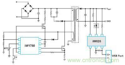 典型的手機充電器的硬件結構(以基於Dialog方案的高通QC2.0快充協議為例)如圖 1所示。iW626作為QC2.0協議控製器,經由USB口的D+/D-信號和手機側AP進行供電協商,然後通過光耦控製原邊的AC/DC控製器iW1780完成輸出電壓的調整。