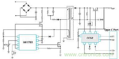 基於PD協議的充電器電路可以維持AC/DC部分不變,隻是將QC協議控製器替換為PD控製器[1],比如Cypress半導體的CCG2(Type-C Controller Generation 2). CCG2 是最早通過USB-IF認證的PD控製器之一,內部包含ARM® Cortex®-M0處理器和完備的PD協議收發器,可以滿足充電器,主機,附件,EMAC線纜等各種支持Type-C口的應用,在蘋果,聯想,HP,Dell,小米,樂視等一線品牌客戶都有眾多的量產案例。