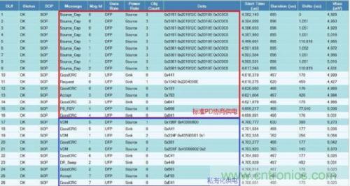 為了更加有效開發和準確驗證基於控製流程的協議溝通,本文采用賽普拉斯研發的PD協議分析儀CY4500 EZ-PD™ Protocol Analyzer。CY4500 協議分析儀通過抓取配置通道(CC,Configuration Channel)上的數據包,並通過USB接口發送到主機端,通過軟件EZ-PD Analyzer Utility解碼並顯示PD協議包。CY4500不僅可以實時顯示並解析PD通信包,而且還實時測量電力傳輸過程中的電壓和電流值,進而縮短了開發周期,對於調試以及兼容性測試幫助非常大。