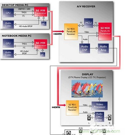HDMI(High DefiniTIon MulTImedia)是在2002年由日立、鬆下、飛利浦、Silicon Image、索尼、湯姆遜、東芝共7家公司成立的HDMI組織製定的全新數字視頻/音頻傳輸標準。初始版本為HDMI 1.0,06年底繼而頒布1.3標準,HDMI在針腳上與DVI兼容,隻是封裝規格不同,但HDMI相較於DVI大幅增加了信道帶寬,輕鬆應對目前高端市場高分辨率高刷新率帶來的數據傳輸壓力。