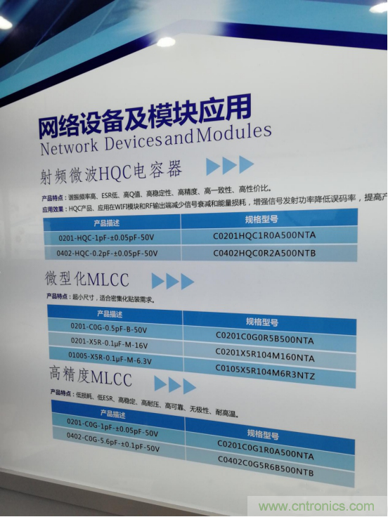 在展區,宇陽科技展示了各種應用的電容,如網路設備及模塊應用射頻微波HQC電容器、手機應用中超微型MLCC、用於安防產品高溫型MLCC、用於汽車電子應用中的高容MLCC等。
