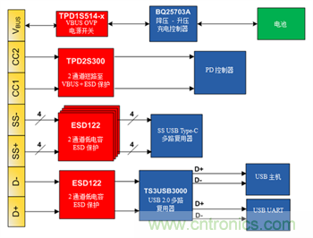 您可將TPD2S300與其他保護裝置(如TPD1S514(過壓+衝擊+VBUS的ESD保護)和ESD122 (雙通道低電容ESD保護))配對,為USB Type-C連接器提供一體式解決方案(圖2)。