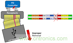 圖1:將VBUS短路到CC和SBU管腳將導致下遊電路故障