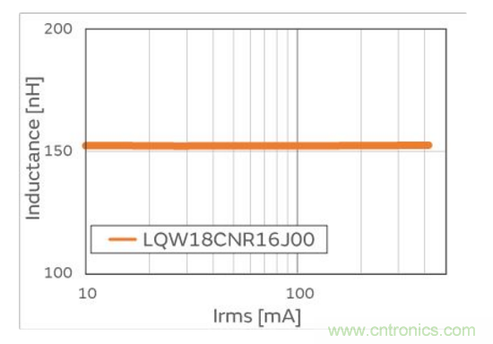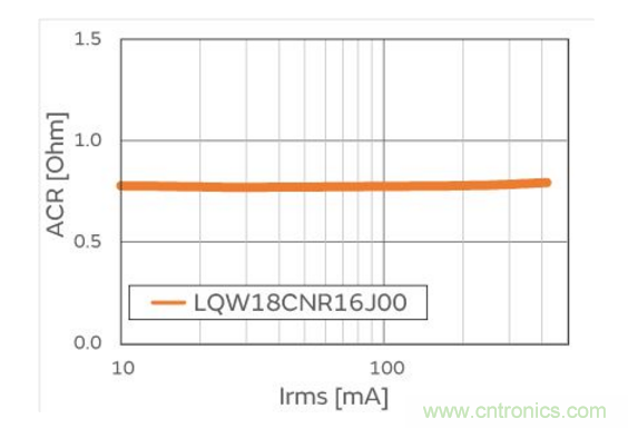 由於電感器的電流值發生變化,電感值也會發生變化。如圖2所示,LQW18CN係列對於AC電流的電感值依存性非常小。因此,即使NFC電路流通的AC電流變大,特性也不會發生很大變化。此外,如圖3 所示,即使是大電流也能保持低ACR。