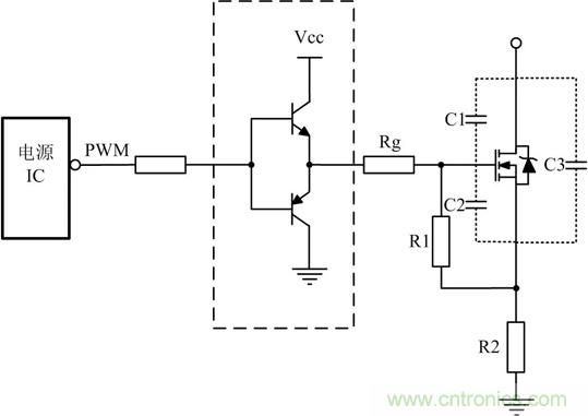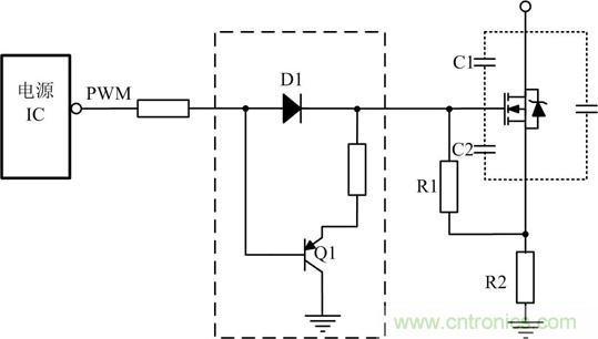 如果選擇MOS管寄生電容比較大,電源IC內部的驅動能力又不足時,需要在驅動電路上增強驅動能力,常使用圖騰柱電路增加電源IC驅動能力,其電路如圖 2虛線框所示。