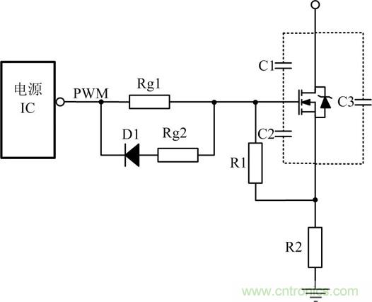 關斷瞬間驅動電路能提供一個盡可能低阻抗的通路供MOSFET柵zha源yuan極ji間jian電dian容rong電dian壓ya快kuai速su泄xie放fang,保bao證zheng開kai關guan管guan能neng快kuai速su關guan斷duan。為wei使shi柵zha源yuan極ji間jian電dian容rong電dian壓ya的de快kuai速su泄xie放fang,常chang在zai驅qu動dong電dian阻zu上shang並bing聯lian一yi個ge電dian阻zu和he一yi個ge二er極ji管guan,如ru圖tu3所示,其中D1常用的是快恢複二極管。這使關斷時間減小,同時減小關斷時的損耗。Rg2是防止關斷的時電流過大,把電源IC給燒掉。