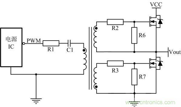 為了滿足如圖5所示高端MOS管的驅動,經常會采用變壓器驅動,有時為了滿足安全隔離也使用變壓器驅動。其中R1目的是抑製PCB板上寄生的電感與C1形成LC振蕩,C1的目的是隔開直流,通過交流,同時也能防止磁芯飽和。