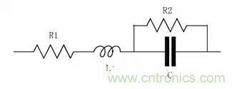片狀電容在射頻電路中的應用十分廣泛,它可以用於濾波器調頻、匹配網絡、晶體管的偏置等很多電路中,因此很有必要了解它們的高頻特性。電容的高頻等效電路如圖所示,其中L為引線的寄生電感;描述引線導體損耗用一個串聯的等效電阻R1;描述介質損耗用一個並聯的電阻R2。