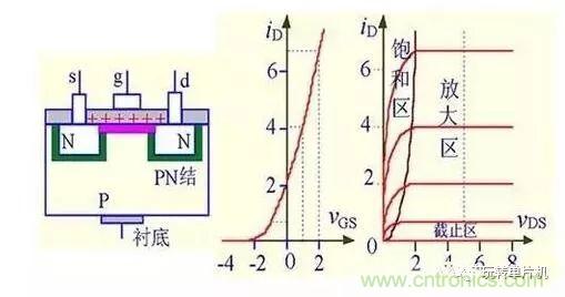 (1)N溝道耗盡型:製造時在柵極絕緣層中摻有大量的正離子,所以即使在VGS=0時,由於正離子的作用,兩個N區之間存在導電溝道(類似結型場效應管)。