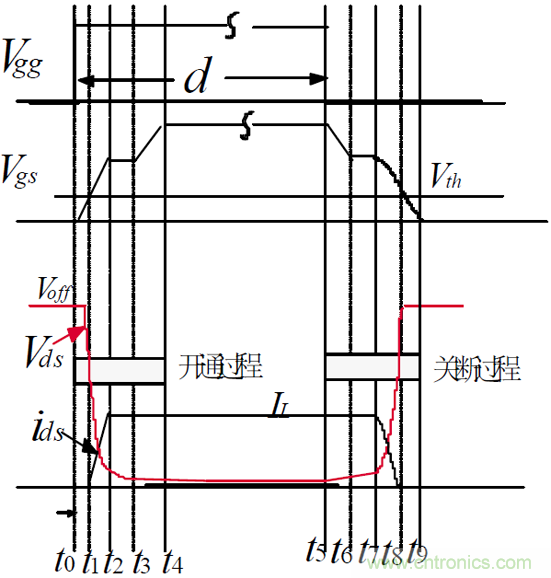 -- [t0-t1]區間,MOSFET 的GS 電壓經Vgg 對Cgs充電而上升,在t1時刻,到達維持電壓Vth,MOSFET 開始導電;