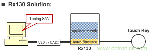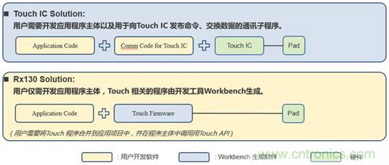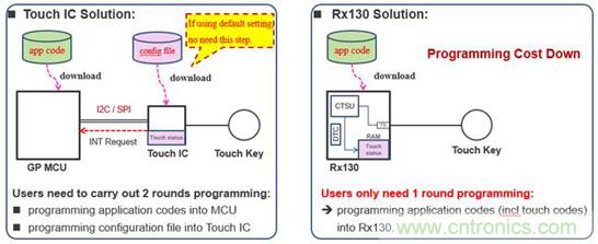 從程序燒寫的成本,比較二者的不同。如圖4所示,如果用戶不使用觸控 IC的缺省參數,而是使用結合具體應用方案優化後的參數,那麼需要通過編程器將最新的參數固化到觸控 IC。特別是批量生產時,增加了燒錄觸控 IC的額外成本。而右圖所示的Rx130方案中,僅需要將應用程序燒錄到Rx130中。