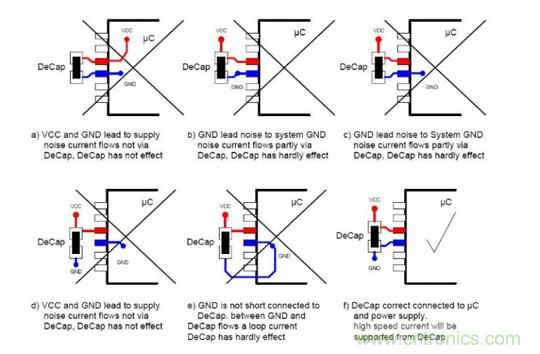 一顆小小的退耦電容,引發的糾結,首先來說說退耦電容的布局布線,下圖中a-e都不對?是由哪些因素引起的呢?
