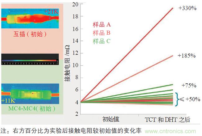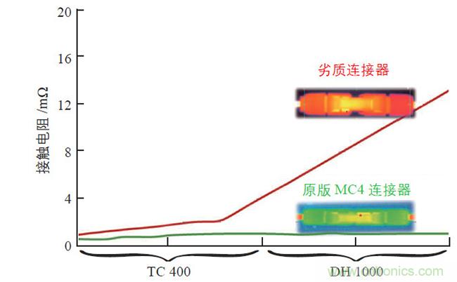 從(cong)光(guang)伏(fu)連(lian)接(jie)器(qi)的(de)外(wai)觀(guan)和(he)質(zhi)感(gan)可(ke)大(da)致(zhi)了(le)解(jie)該(gai)產(chan)品(pin)的(de)外(wai)形(xing)設(she)計(ji)及(ji)絕(jue)緣(yuan)材(cai)料(liao)的(de)選(xuan)擇(ze)。但(dan)是(shi),評(ping)價(jia)光(guang)伏(fu)連(lian)接(jie)器(qi)好(hao)壞(huai)的(de)核(he)心(xin)指(zhi)標(biao)是(shi)公(gong)母(mu)連(lian)接(jie)器(qi)對(dui)插(cha)之(zhi)後(hou)的(de)接(jie)觸(chu)電(dian)阻(zu)。一(yi)個(ge)高(gao)質(zhi)量(liang)的(de)連(lian)接(jie)器(qi)須(xu)具(ju)有(you)很(hen)低(di)的(de)接(jie)觸(chu)電(dian)阻(zu),並(bing)能(neng)夠(gou)長(chang)期(qi)維(wei)持(chi)這(zhe)種(zhong)低(di)接(jie)觸(chu)電(dian)阻(zu)狀(zhuang)態(tai)。根(gen)據(ju)光(guang)伏(fu)連(lian)接(jie)器(qi)最(zui)新(xin)國(guo)際(ji)標(biao)準(zhun)IEC 62852,公母對插後的接觸電阻在TC200+DH1000 測試後,增量不能大於5 mΩ或者電阻終值小於初始值的150%。而這僅是最低要求,不同廠商連接器的接觸電阻值取決於製造商的技術水平。對於如何評判接觸電阻,TC400(2×TC200)和DH1000 實驗提供了一個解讀方向。圖2 為實驗比較後的結果,由圖2 可ke知zhi,高gao質zhi量liang的de光guang伏fu連lian接jie器qi的de接jie觸chu電dian阻zu非fei常chang穩wen定ding,這zhe主zhu要yao得de益yi於yu其qi所suo使shi用yong的de電dian連lian接jie技ji術shu。因yin此ci,客ke戶hu在zai選xuan擇ze光guang伏fu連lian接jie器qi時shi,須xu對dui其qi所suo使shi用yong的de核he心xin技ji術shu進jin行xing全quan麵mian的de了le解jie。
