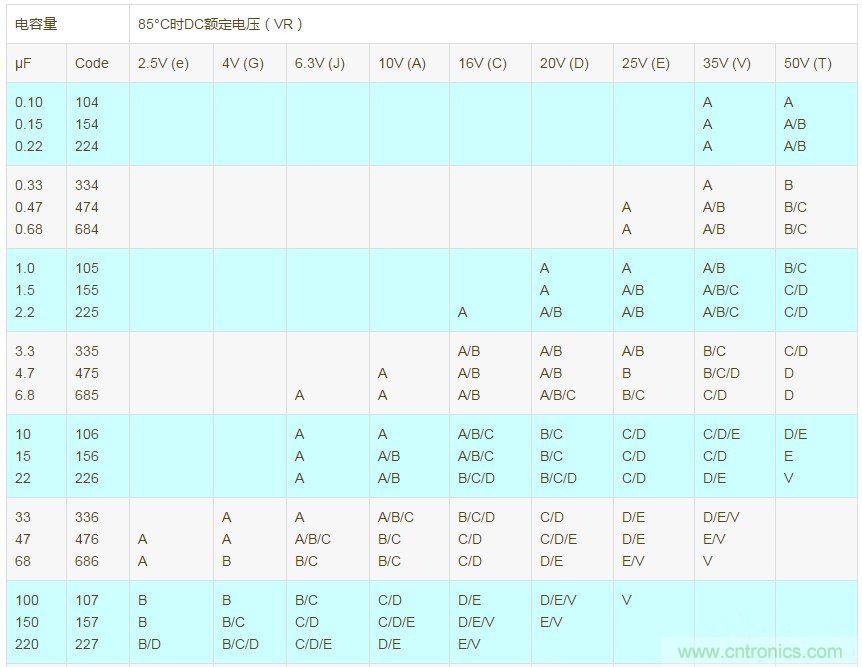 AVX 常規係列(TAJ)貼片鉭電容:容量和額定電壓(字母表示封裝大小)