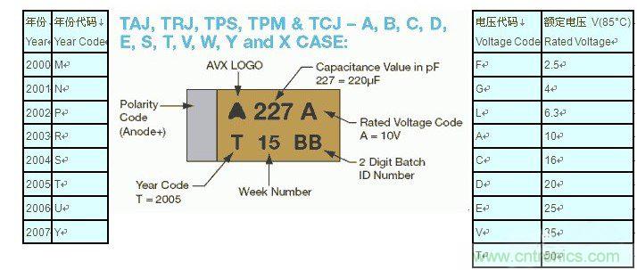 ① 表示係列,AVX 有TAJ 和TPS 兩個係列,TAJ 表示普通鉭電容,TPS 表示的是