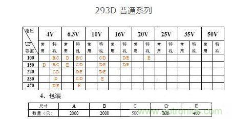 ① 表示係列,VISHAY 有293D 和593D 兩個係列,293D 表示普通鉭電容,593D
