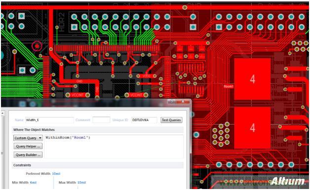 在Room裏框選出一定區域後,不僅僅是可以單獨設置線寬規則,還可以對它設置PCB Rule規則定義頁麵上的任意規則。