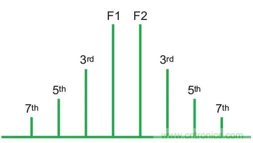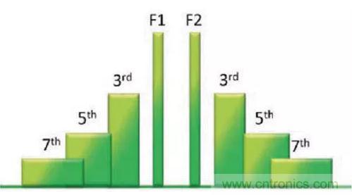 當提到PIM產品時,n + m的總和稱為產品訂單,因此如果m為2且n為1,則結果稱為三階產品(圖1)。通常情況下,三階產品最強,造成的危害最大,其次是五階和七階產品。由於訂單增加時PIM振幅變低,因此高階產品通常不足以引起直接頻率問題,但通常有助於提高相鄰噪聲基底(圖2)。