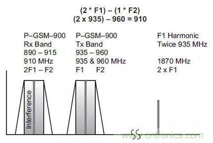 廣泛使用的900 MHz頻段的PIM示例假定兩個GSM載波,一個在935 MHz,另一個在960 MHz。在這種情況下,910 MHz三階產品位於基站接收頻段(圖4)。
