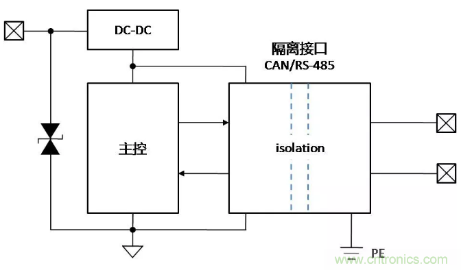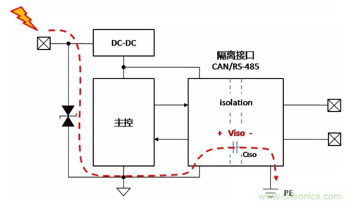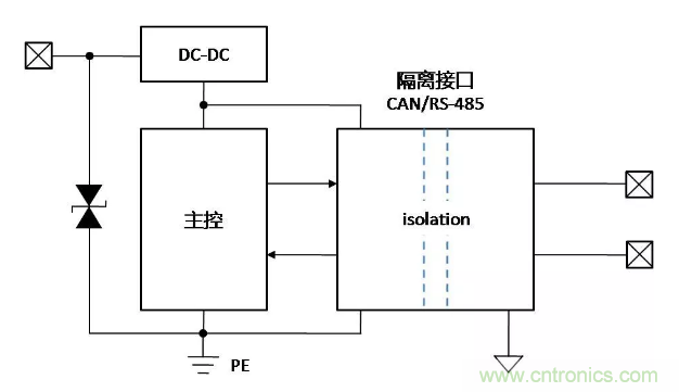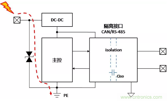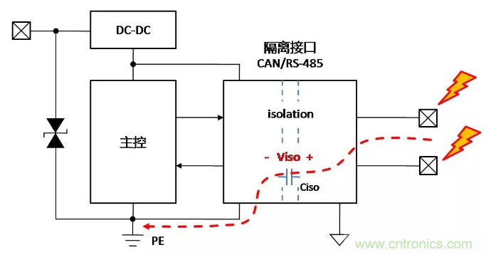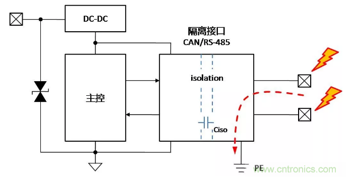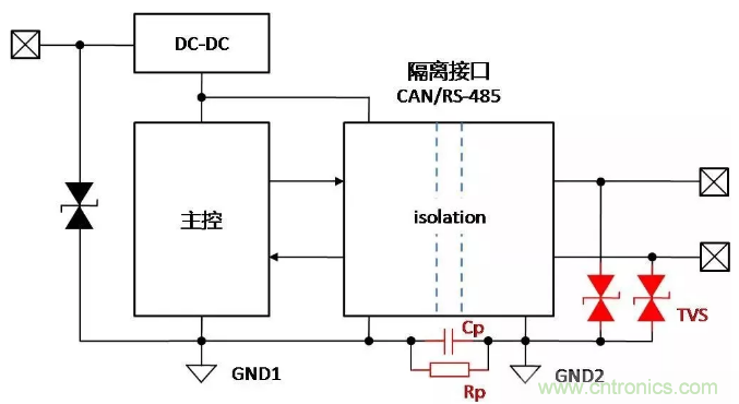 總線增加隔離固然可以保證總線穩定可靠地通信,但是帶隔離通信接口的設備,在複雜的環境或安裝狀態下,接口會表現出完全不同的ESD特性,了解ESD對接口的影響機理,才能有針對性地增加保護器件,提升隔離接口的ESD能力。下麵以帶有隔離CAN或RS-485通信接口為例,對常見的設備狀態下,ESD的作用機理進行分析,並提出相應的改善措施。