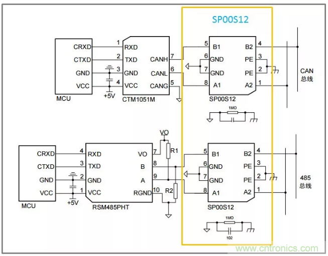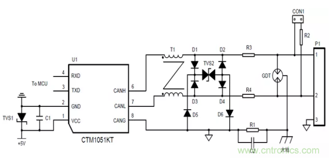 前麵隻是對ESD的作用機理進行了分析,但隨著工業產品對通信接口的EMC等級要求越來越高。許多應用要求滿足IEC61000-4-2靜電放電4級,IEC61000-4-5浪湧抗擾4級要求。一般的收發器ESD、浪湧的防護等級均比較低,如CTM1051M隔離CAN收發器的隔離耐壓為2500VDC,裸機情況下,ESD、浪湧等級均較低。所以有必要增加外圍電路,提高通信端口的EMC等級。