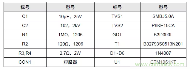 以CAN總線為例,上圖為完善的外圍推薦電路。其中GDT置於最前端,提供一級防護,當雷擊、浪湧產生時,GDT瞬間達到低阻狀態,為瞬時大電流提供泄放通道,將CAN_H、CAN_L間電壓鉗製在二十幾伏範圍內。實際取值可根據防護等級及器件成本綜合考慮進行調整,R3 與 R4 建議選用 PTC,D1~D6 建議選用快恢複二極管,參數表如下。