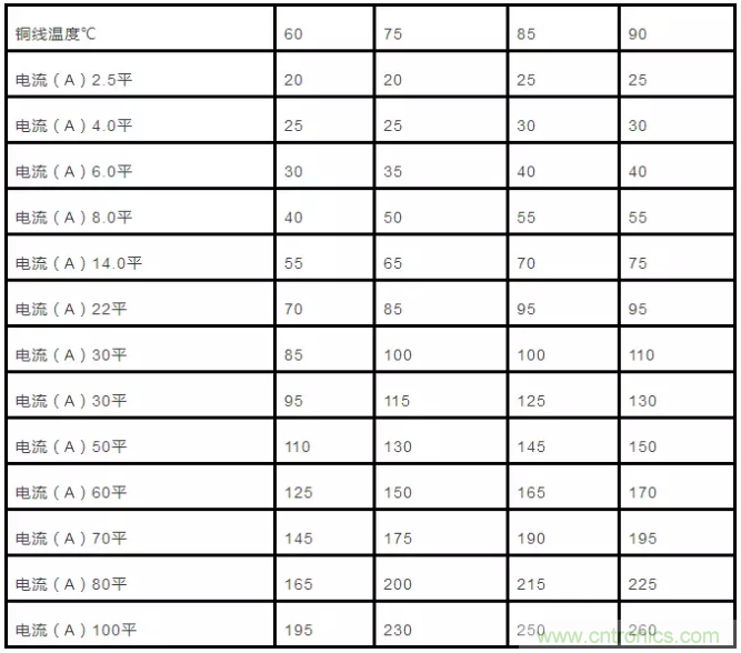 下麵是銅線在不同溫度下的線徑和所能承受的最大電流表格。