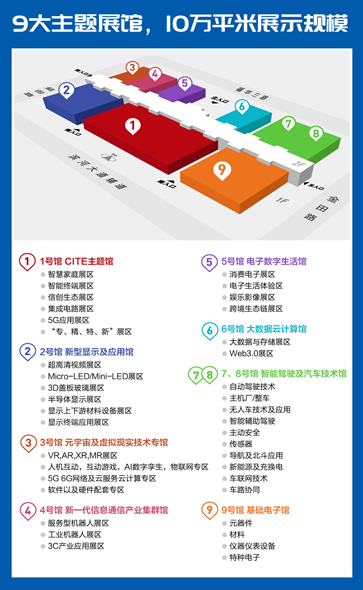本屆中國電子信息博覽會使用深圳會展中心的全部9個展館,其中1號館為CITE主題館,2號館為新型顯示及應用館,3號館為元宇宙及虛擬現實技術專館,4號館為新一代信息通信產業集群館,5號館為大數據雲計算館,7、8號館為智能駕駛及汽車技術館,9號館為基礎電子館。