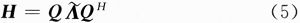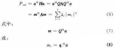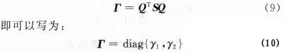 式中:A=diag{λ1,λ2},而Q是幺正的(即QQH=I)。根據厄米特矩陣的性質,兩個正交值λ1和λ2都是實數,並且小於等於1。將式(5)代入式(4)得:
