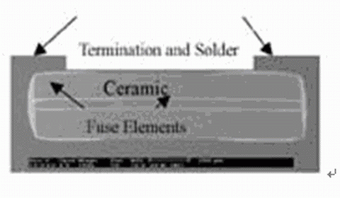---AEM SolidMatrix SMD熔斷器與常規片式熔斷器在結構方麵具有顯著的不同:它(ta)是(shi)疊(die)層(ceng)多(duo)元(yuan)陶(tao)瓷(ci)獨(du)石(shi)結(jie)構(gou)。所(suo)謂(wei)多(duo)元(yuan)就(jiu)是(shi)指(zhi)它(ta)具(ju)有(you)分(fen)離(li)的(de)多(duo)層(ceng)熔(rong)斷(duan)單(dan)元(yuan)。熔(rong)斷(duan)單(dan)元(yuan)之(zhi)間(jian)用(yong)有(you)很(hen)好(hao)滅(mie)弧(hu)作(zuo)用(yong)的(de)陶(tao)瓷(ci)材(cai)料(liao)隔(ge)開(kai)。熔(rong)斷(duan)單(dan)元(yuan)位(wei)於(yu)陶(tao)瓷(ci)結(jie)構(gou)的(de)中(zhong)部(bu),夾在較厚的陶瓷層中間(見圖1)。其多層熔斷元件結構可以大大增加熔斷元件與滅弧材料的接觸麵積,使滅弧反應的時間縮短。