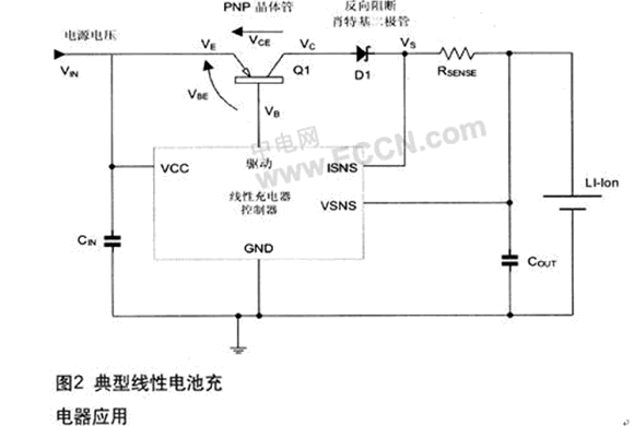 線性充電器設計簡單,體積較小,並且沒有"開關模式轉換器"常有的噪音,這些優點使得線性充電器特別適用於小功率、低噪音應用。線性充電器使用外部調節元件,以將電池電壓由輸入電源降至電池電壓,因此功率損耗較大。圖2顯示具備外部調節元件與反向阻斷肖特基二極管的典型線性充電器應用。