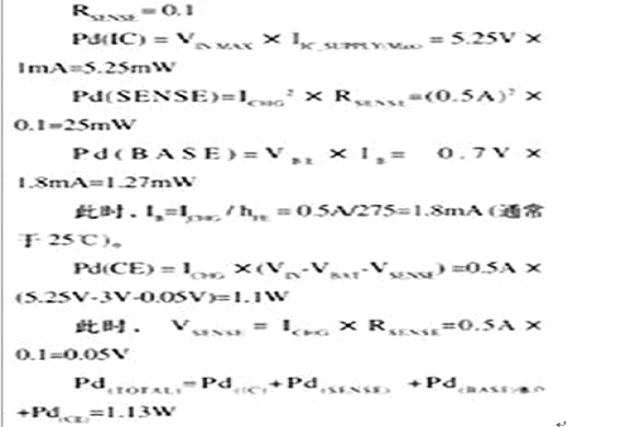 當電池處於預充電壓閾值(VPRE),充電階段進入快速充電-恒(heng)流(liu)階(jie)段(duan),此(ci)時(shi)將(jiang)產(chan)生(sheng)最(zui)大(da)功(gong)率(lv)損(sun)耗(hao)。對(dui)於(yu)正(zheng)常(chang)工(gong)作(zuo)狀(zhuang)態(tai)時(shi)出(chu)現(xian)最(zui)高(gao)功(gong)率(lv)損(sun)耗(hao)的(de)情(qing)況(kuang),其(qi)主(zhu)要(yao)功(gong)率(lv)損(sun)耗(hao)區(qu)及(ji)計(ji)算(suan)範(fan)例(li)如(ru)下(xia)所(suo)示(shi)。此(ci)應(ying)用(yong)實(shi)例(li)的(de)電(dian)池(chi)規(gui)格(ge)為(wei):電池:單室鋰離子500mAh如用於便攜式手持設備(手機、MP3播放器等)