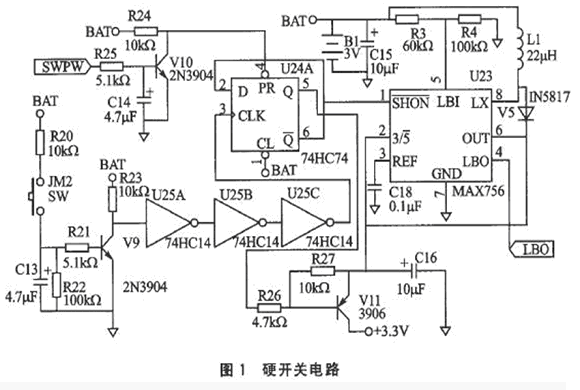 硬開關電路是將2節7號電池的串聯電壓通過DC/DC轉換器MAX756轉換成3.3 V的電壓,電路圖如圖1所示。如果不經升壓電路而直接由電池供電,那麼因電池端產生的電壓存在一個由高到低的下降過程。2節新電池的串聯電壓在3 V以上,隨著能量的耗盡,會下降到2V以下,導致機器無法正常工作。JM2按鍵為開/關機鍵,在按動JM2時,由於按鍵的抖動,會產生誤動作。由R20, C13, R21,R22, R23, V9構成的充放電回路,作用是通過適當地選擇R20,C13,R21的值,使充放電回路的充電時間與放電時間都大於鍵抖動時間,從而有效地消除鍵的抖動。V9集電極輸出的按鍵脈衝經去抖後,再通過U25 (74HC14)三個帶施密特觸發器的反相器進一步濾波整形,產生波形完整的單脈衝。由該脈衝觸發U24A(74HC74 D觸發器)的翻轉。