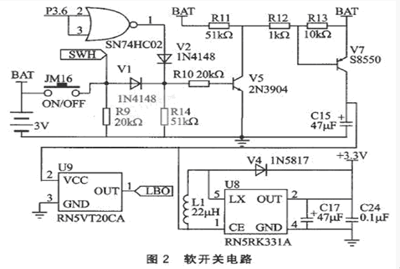 與圖1相比較,用JM16鍵開機後,還必須利用單片機P3.6 輸出低電平實現開機自保,因此稱該電路為“軟開關電路”。使shi用yong該gai軟ruan開kai關guan電dian路lu的de優you點dian是shi無wu須xu考kao慮lv按an鍵jian去qu抖dou動dong問wen題ti,硬ying件jian電dian路lu簡jian單dan,可ke降jiang低di硬ying件jian成cheng本ben,節jie約yue印yin製zhi板ban板ban麵mian,在zai手shou持chi式shi產chan品pin中zhong印yin製zhi板ban板ban麵mian是shi非fei常chang寶bao貴gui的de(元器件的數量直接影響印製板的大小和產品整體外觀)。缺點是當受到外界強信號幹擾或由於電池電量不足而引起死機時,按鍵JM16jiangbuqizuoyong,bixuquchudianchi,zaizhongxinzhuangrufangnengjiejuesijixianxiang。dangranzhezhongqingkuangchuxiandejilvjidi,qieyindianchidianliangbuzueryinqisijishi,jiuxuyaogenghuandianchile。ertu1的硬開關電路中,當碰到死機現象時,無需觸摸電池,通過按鍵JM2就能實現開機和關機。