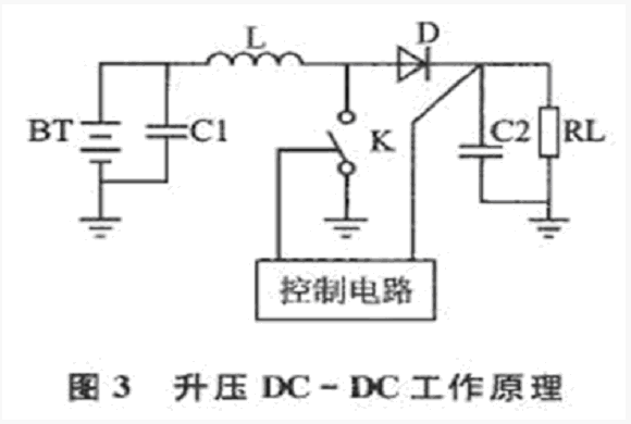 開關K導通時電池BT給電感L充電,在L中以場的形式儲存能量1/(2L×I2)。 其中,I為電感電流。K斷開後,L中的磁能又以電能的形式釋放給濾波電容C2和負載RL。周期性的開關操作使電池能量源源不斷地送入負載,而輸出電壓被轉換為: