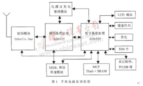 數字移動電話的電路由射頻與基帶兩大部分組成。其中射頻(RF)電路包括收發器、頻率合成器和功放等,基帶(Baseband)電路包括數字信息處理和控製器、存儲器、電源管理和其他外設部分。以ADI手機為例,其原理框圖如圖1所示。