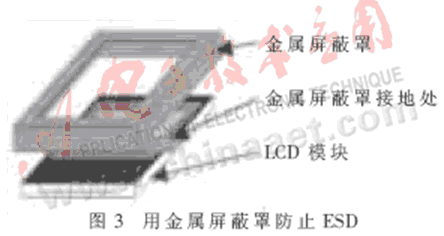 其二,用“疏”的方法。可以用EMI油漆噴塗在殼體的內側。EMI油漆是導電的,可以看成是一個金屬的屏蔽層,這樣可以將靜電導在殼體上;再將殼體與PCB(Printed Circuit Board)的地連接,將靜電從地導走。這樣處理的方法除了可以防止靜電,還能有效抑製EMI的幹擾。如果有足夠的空間,還可以用一個金屬屏蔽罩將其中的電路保護起來,金屬屏蔽罩再連接PCB的GND。圖3是用金屬屏蔽罩將LCD模塊保護起來的例子。