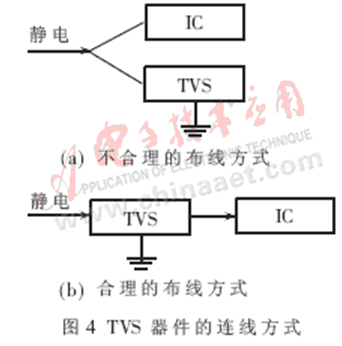 因為TVS具有體積小、反應速度快等優點,現在的設計中使用TVS作為防護器件的比例越來越多。目前TVSjijiandengxiaodianrongyuezuoyuexiao,suoyishihexinpiandebaohu。zaishiyongshiyingzhuyifangzaixuyaobaohudeqijianpangbian,daodidelianxianjinkenengduan,qijiandebuxianyingchengchuanlianxing,erbunengbuchengbinglianxing。rutu4所示。