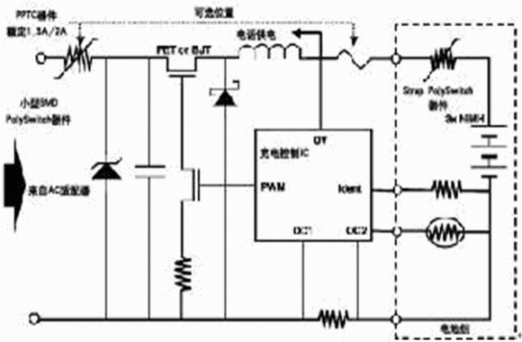 在該電路中,未經穩壓的電源轉換器直流輸出電壓經過穩壓電路調製,轉變成適當的電壓對電池進行充電。PPTC器件和電壓過載保護器件相互配合,可以對以下故障起保護作用: