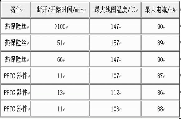 在變壓器中采用PPTC保護器件,則既簡單又節省成本。隻用一個額定電壓為240V(AC)的PPTCqijian,anzhuangzaibianyaqideyuanbian,jiukedaitilianggerebaoxiansishixianchaowenjiguoliubaohu。dangguzhangfashengshi,zaixianquanwendushenggaodandianliubingmeiyouxianzhudezengjiadeqingkuangxia,dianlubaohuyuanjianzhongdechaowenqijianjiuxiandefeichangzhongyao。digonglvdianyuanbianyaqishiciyingyongdeyigehenhaodeshili。jishifubianyouduanlufashengshi,PPTC器件的電阻將增大,電流被限製在很低的範圍內,起到保護變壓器的作用,避免如圖5那樣毀壞性的故障。表1是一個120V交流變壓器,采用熱保險絲和PPTC器件保護時的比較數據。