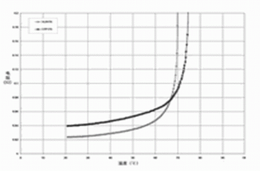 圖2 針對 PolySwitch SRP,VTP及VLR聚合物的PTC材料使用的無源阻抗 vs, 溫度曲線