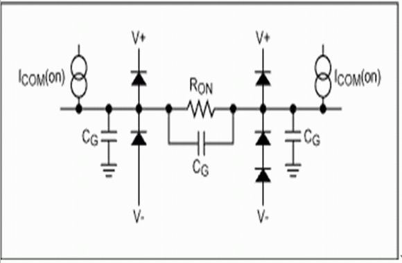 模擬開關內的通道元件通常包括一個或更多的MOSFET,同時還包含有寄生鉗位二極管(鉗位至電源電壓),用於ESD保護。圖1顯示了一個閉合的模擬開關的等效電路圖。隻要V+和V-存在,並且輸入電壓不超過:電源電壓 + 鉗位二極管的正向偏壓(典型0.6V),二極管就處於反向偏置,沒有電流通過。