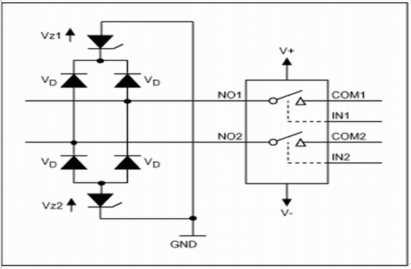 在現有設計中,大多數係統工作於標準電源電壓(單極性3.3V或5V,或雙極性±3.3V或±5V),這(zhe)個(ge)電(dian)壓(ya)通(tong)常(chang)也(ye)是(shi)板(ban)上(shang)的(de)最(zui)高(gao)電(dian)壓(ya)。在(zai)實(shi)際(ji)使(shi)用(yong)中(zhong),電(dian)路(lu)板(ban)的(de)輸(shu)入(ru)端(duan)子(zi)可(ke)能(neng)會(hui)暴(bao)露(lu)於(yu)比(bi)電(dian)源(yuan)電(dian)壓(ya)更(geng)高(gao)的(de)電(dian)壓(ya)之(zhi)下(xia),同(tong)時(shi),電(dian)路(lu)板(ban)電(dian)源(yuan)被(bei)切(qie)斷(duan)後(hou),輸(shu)入(ru)端(duan)子(zi)上(shang)的(de)電(dian)壓(ya)有(you)可(ke)能(neng)仍(reng)然(ran)存(cun)在(zai)。受(shou)這(zhe)種(zhong)過(guo)壓(ya)影(ying)響(xiang)的(de)第(di)一(yi)個(ge)元(yuan)件(jian)常(chang)常(chang)是(shi)多(duo)路(lu)複(fu)用(yong)器(qi)或(huo)開(kai)關(guan),這(zhe)就(jiu)要(yao)求(qiu)為(wei)開(kai)關(guan)元(yuan)件(jian)和(he)下(xia)遊(you)電(dian)路(lu)提(ti)供(gong)適(shi)當(dang)的(de)保(bao)護(hu)。